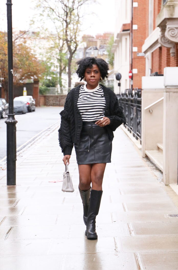 Now, to this neutral black-and-white look, I kept it chic, sleek and polished, yet it’s still quite effortless and comfortable. The basic black and white stripe crew neck t-shirt’s simple and casual while the fuzzy oversized cardigan in a soft cable knit, adds a relaxed, cosy vibe. The piece de résistance is the knee-high boots to help keep your legs warm and toasty sans tights for a chic fall ensemble.